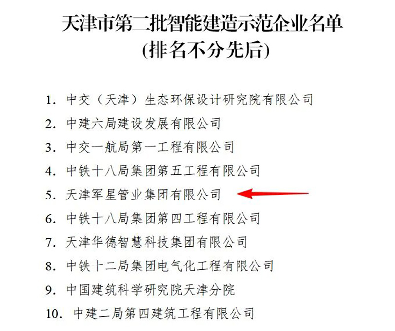 为深入贯彻落实《天津市智能建造试点城市实施方案》的文件精神和要求,天津市住房和城乡建设委员会近期组织开展了第二批智能建造示范企业专家评审工作。经评审专家严格、公正的综合审定,最终确定了17家单位为天津市智能建造示范企业。军星管业凭借其在管道制造领域的智能化建设与创新实践成功入选。